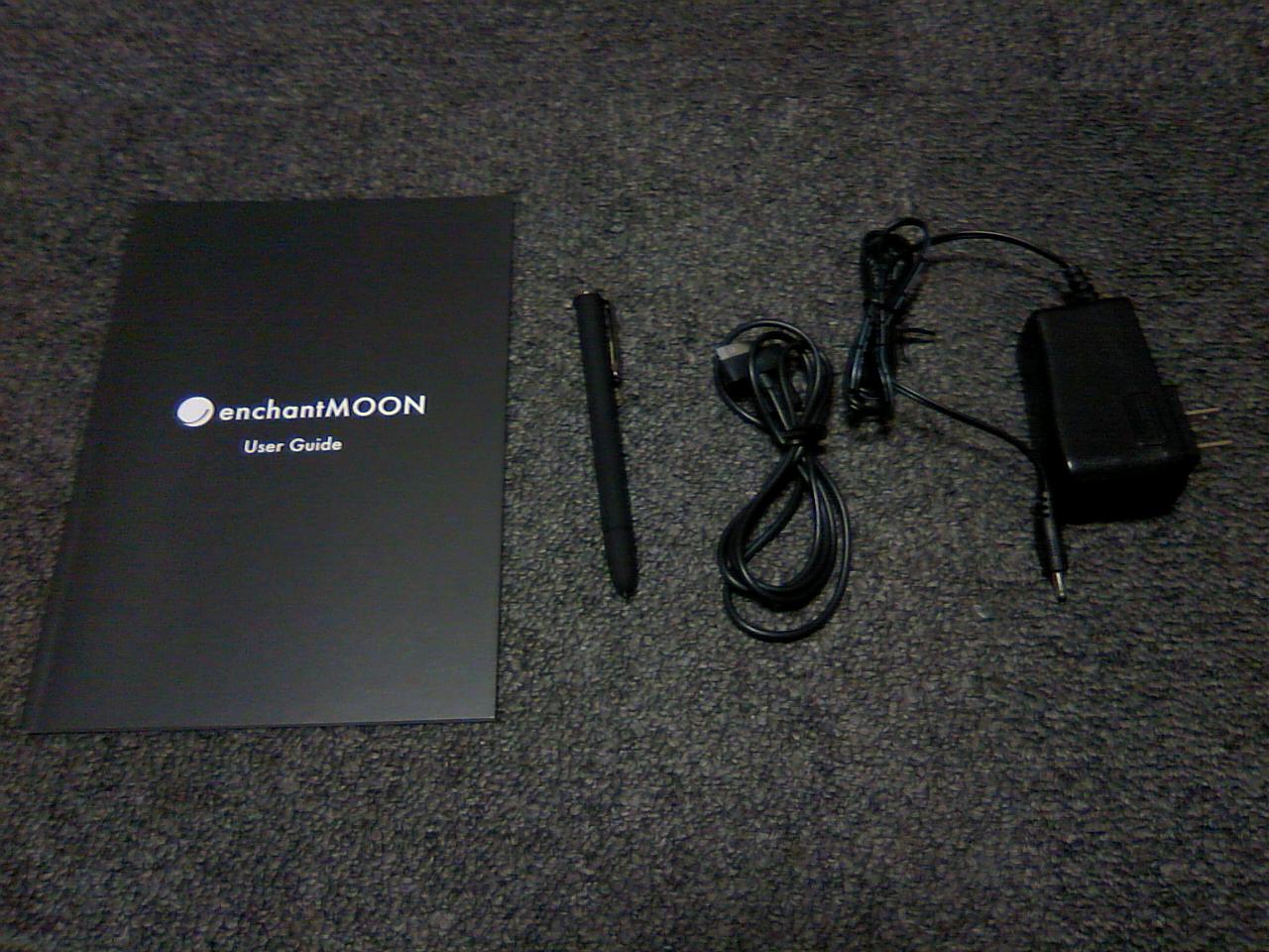 左からマニュアル、デジタイザペン、PC接続ケーブル、充電ケーブル。