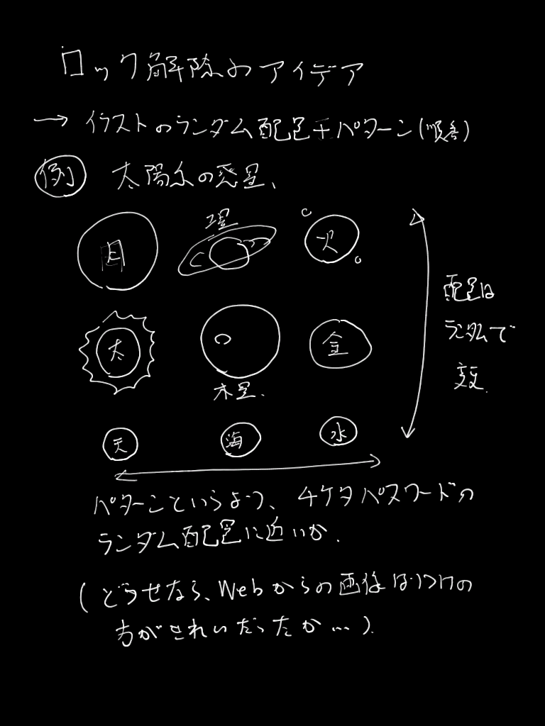 通常のパターン認証と同じく、特定の順番でポインタをなぞるのですが、このポインタを何かのイラストにしてはどうでしょうか。例えば、太陽系の惑星とか良いかもしれませんね。